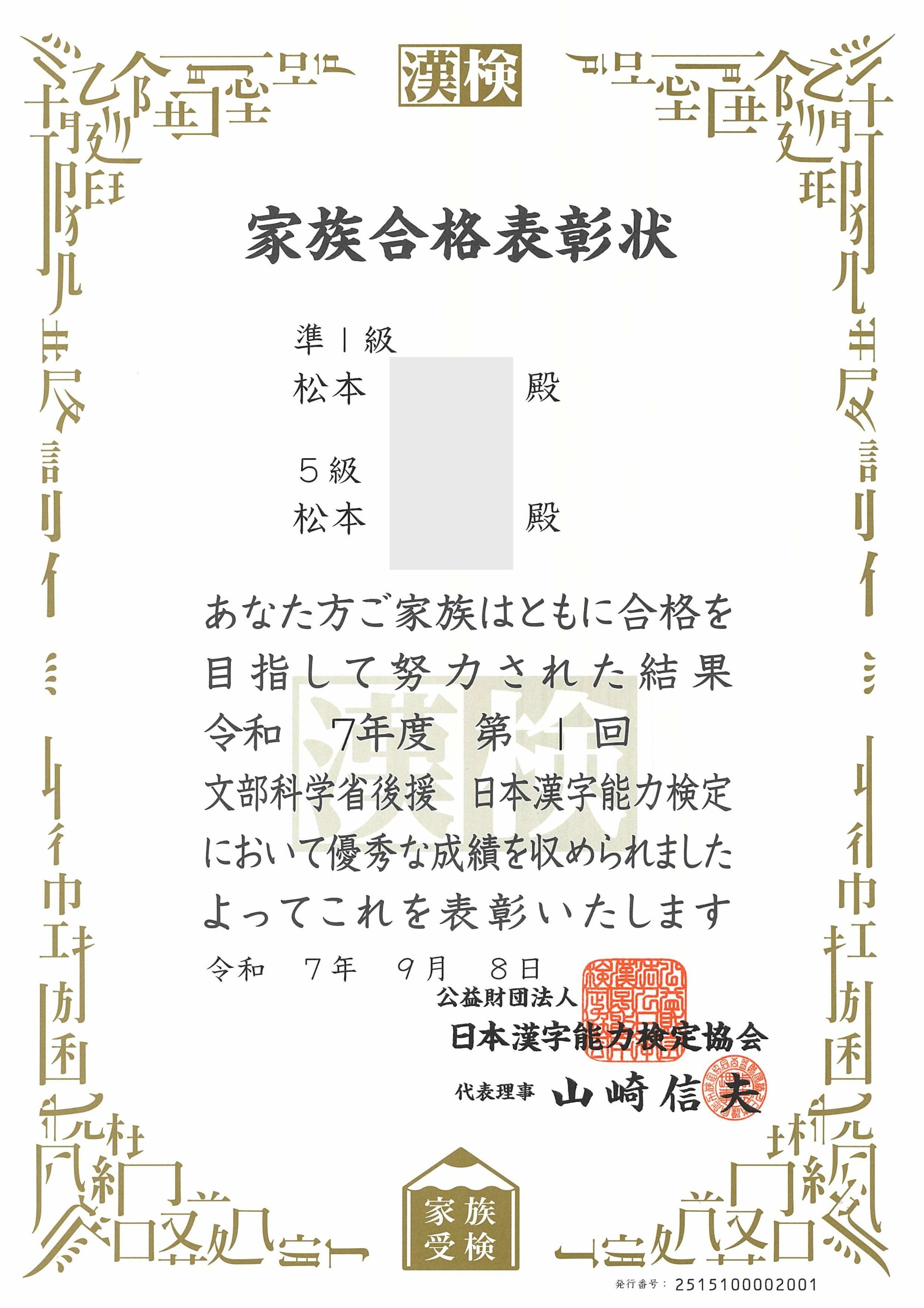 今までもらった合格証書は、それぞれファイルに入れて保管しているのですが、漢字検定には「家族合格表彰制度」があるらしく上の子がその合格証書がほしいとのことで、なぜか私も久しぶりに漢字の勉強をすることに。